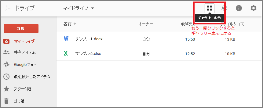 右上の[表示切替]ボタンをクリックすると、ファイルリストの表示形式を「ギャラリー表示」と「リスト表示」に交互に切り替えることができます。